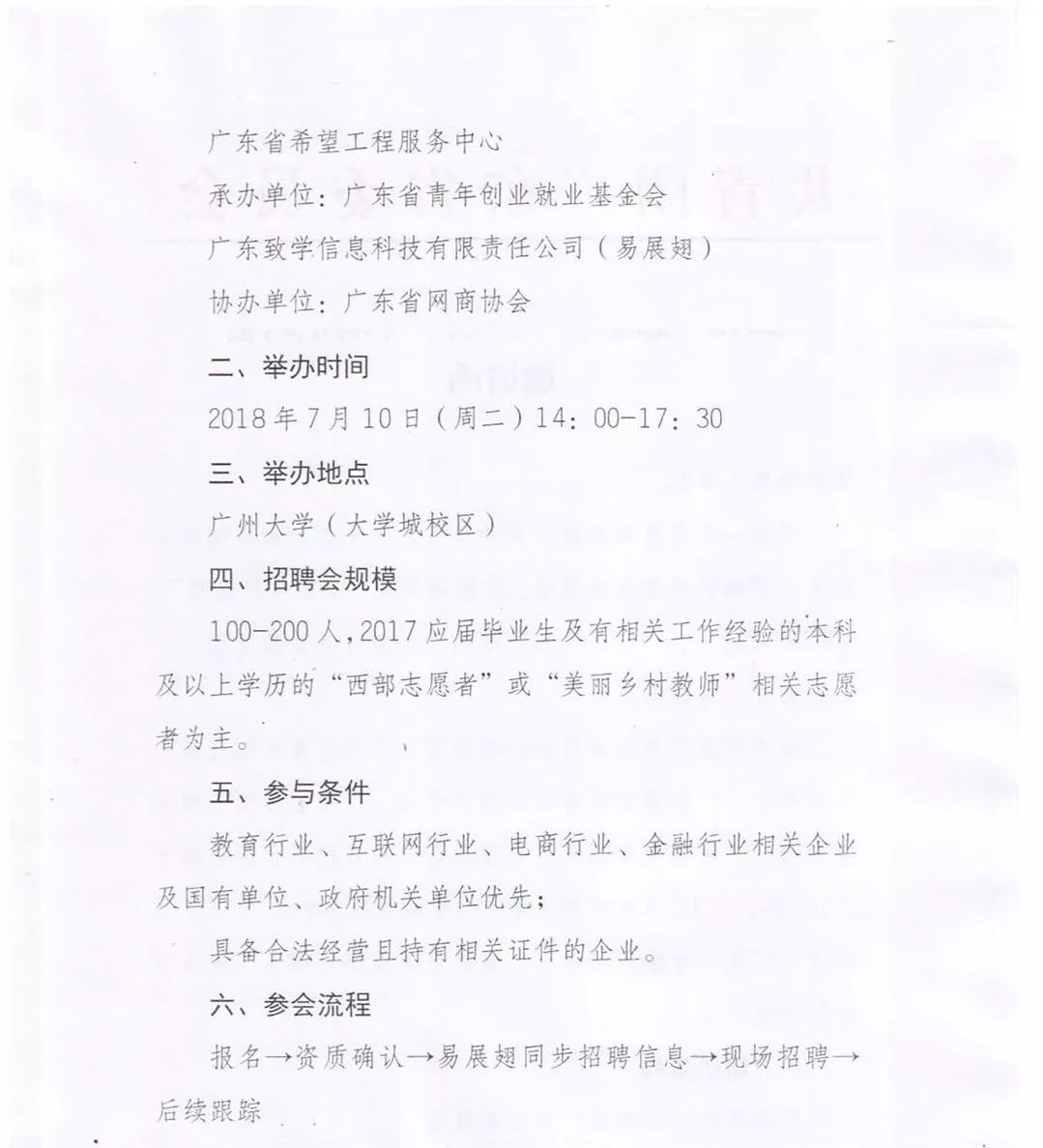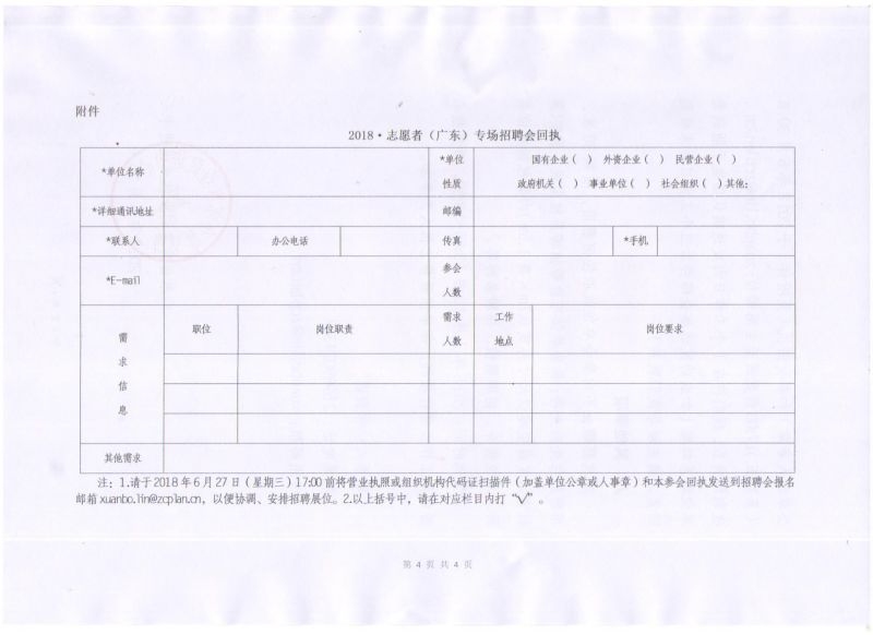 請(qǐng)將單位營(yíng)業(yè)執(zhí)照或組織機(jī)構(gòu)代碼證掃描件(加蓋單位公章或人事章)和參會(huì)回執(zhí)(見附件)于2018年6月30日(星期五)17:00前發(fā)送至專用郵箱:gdeba@gdeba.org.cn 。收到郵件后,我們會(huì)審核成功后發(fā)送確認(rèn)函電子版到貴單位聯(lián)系郵箱。(如果成功發(fā)送參會(huì)郵件后三個(gè)工作日后未收到回復(fù),請(qǐng)主動(dòng)與我們聯(lián)系)。 本次招聘會(huì)不向參會(huì)單位收取任何費(fèi)用,限額30家,招聘展位先到先得;參會(huì)單位可自帶招聘易拉寶或X展架(易拉寶或X展架建議尺寸為寬0.7mx高1.5m)內(nèi)容包括單位名稱、單位簡(jiǎn)介、招聘職位、招聘條件等。 報(bào)到時(shí)間:2018年7月10日13:00-13:50,請(qǐng)憑報(bào)名短信至工作臺(tái)進(jìn)行報(bào)到,每單位最多2位人員參加。 注:企業(yè)在資料準(zhǔn)備過(guò)程中如有任何問題,請(qǐng)聯(lián)系協(xié)會(huì)工作人員。 鄧小姐:020-8304 0336 傳真: 020-8104 5166 附件: