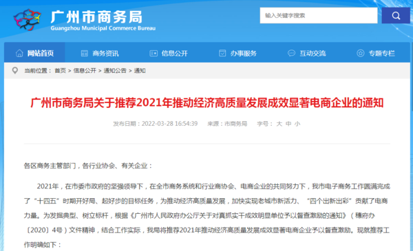 ????????????????近日,廣州市商務(wù)局印發(fā)《關(guān)于推薦2021年推動經(jīng)濟(jì)高質(zhì)量發(fā)展成效顯著電商企業(yè)的通知》(下稱《通知》),部署開展2021年推動經(jīng)濟(jì)高質(zhì)量發(fā)展成效顯著電商企業(yè)推薦工作。此次推薦遴選是按照《廣州市人民政府辦公廳關(guān)于對真抓實干成效明顯單位予以督查激勵的通知》(穗府辦〔2020〕4號),結(jié)合工作實際,在電子商務(wù)領(lǐng)域開展的督查激勵工作,旨在加快培育廣州市電子商務(wù)標(biāo)桿企業(yè),助力國際消費中心城市建設(shè),推動經(jīng)濟(jì)高質(zhì)量發(fā)展。?《通知》對推薦范圍、推薦標(biāo)準(zhǔn)及數(shù)量、推薦企業(yè)激勵措施、申報材料等作出了詳細(xì)規(guī)定。在符合國家法律法規(guī)、信用部門管理規(guī)定以及在廣州市依法登記注冊并納稅、具有獨立法人資格等條件的基礎(chǔ)上,包括電子商務(wù)平臺企業(yè)、電子商務(wù)品牌經(jīng)銷企業(yè)、電子商務(wù)服務(wù)企業(yè)、綜合性電子商務(wù)企業(yè)在內(nèi)的四類電商企業(yè)可以進(jìn)行申報。對被激勵支持的企業(yè),市政府辦公廳將發(fā)文通報表揚,相關(guān)職能部門在同等條件下優(yōu)先向國家、省推薦申報相關(guān)榮譽,優(yōu)先邀請參加直播電商節(jié)(中國·廣州)等政府組織的重大活動,優(yōu)先邀請在其電商平臺發(fā)放政府消費券,并組織媒體參訪團(tuán)進(jìn)行宣傳報道。