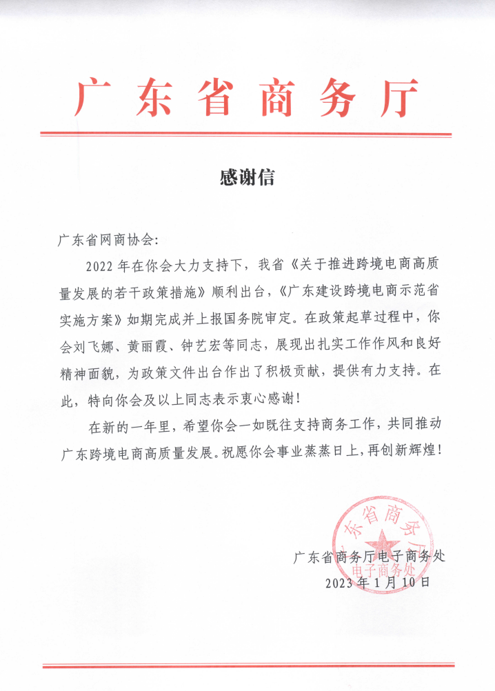 今日,我會收到廣東省商務(wù)廳電子商務(wù)處發(fā)來的感謝信。對我會在《關(guān)于推進跨境電商高質(zhì)量發(fā)展的若干政策措施》《廣東建設(shè)跨境電商示范省實施方案》等政策文件起草過程中的支持工作表示了肯定與感謝!