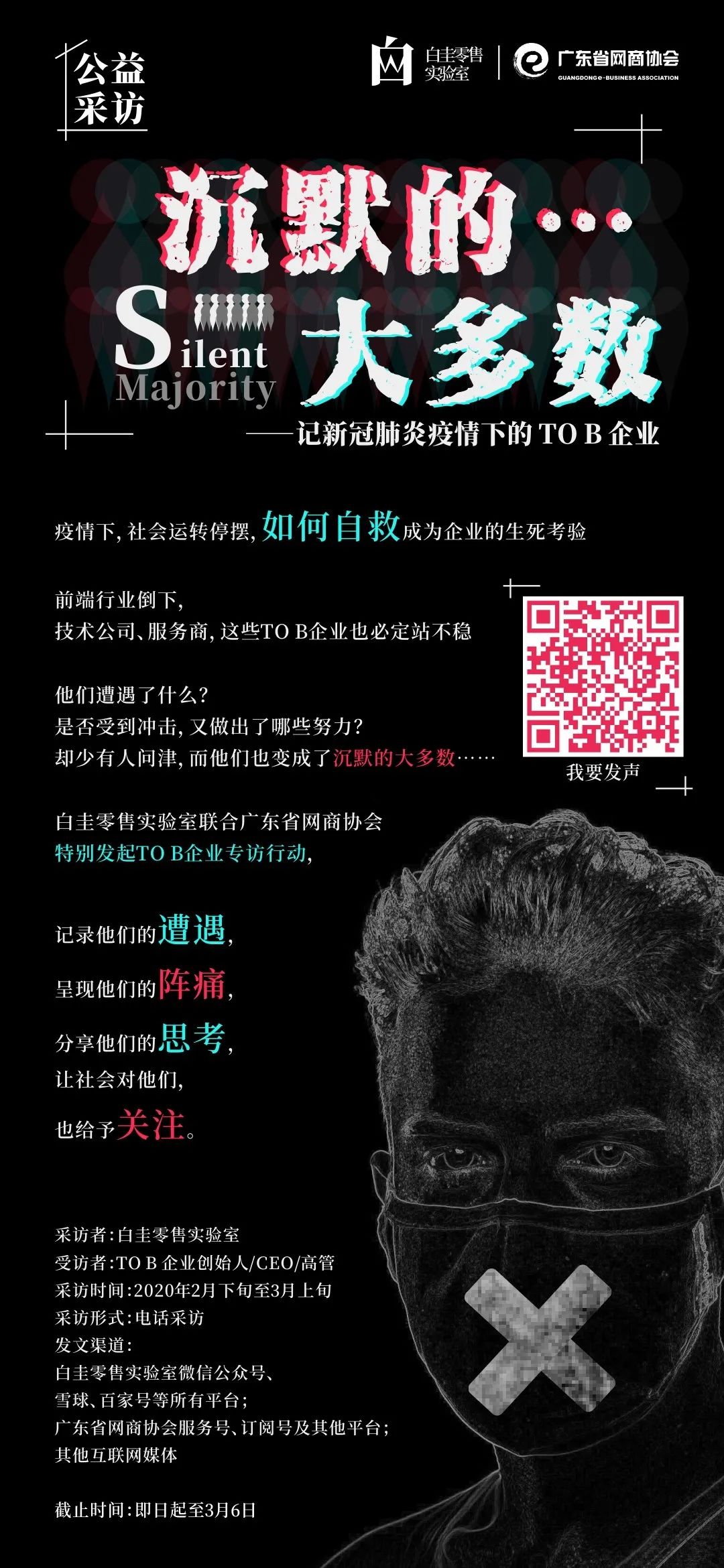 如果有阿拉丁神燈,絕大多數(shù)中國人的愿望恐怕都是重啟2020年。 這場發(fā)端于2019年12月,起源于武漢,在春節(jié)掀起高潮,感染人數(shù)遠(yuǎn)超當(dāng)年SARS的新冠肺炎,深刻地改變了中國。 社會(huì)運(yùn)轉(zhuǎn)停擺,經(jīng)濟(jì)增長停滯,旅游、航空以及酒店、餐飲等線下實(shí)體商業(yè)深受其害,黃金周打水漂,成本居高不下,資金面臨斷裂,一時(shí)間,如何自救成為企業(yè)的生死考驗(yàn)。 知名連鎖餐飲企業(yè)西貝董事長賈國龍?jiān)诿襟w上的呼吁,以及一些線下教育平臺(tái)的倒閉,讓線下商業(yè)的艱難成為輿論的焦點(diǎn)。 然而,經(jīng)濟(jì)的發(fā)展,社會(huì)的運(yùn)轉(zhuǎn)依靠的是環(huán)環(huán)相扣的產(chǎn)業(yè)鏈。就如同多米諾骨牌,前端行業(yè)倒下,技術(shù)公司、服務(wù)商,這些TO B企業(yè)也必定站不穩(wěn)。 他們?cè)庥隽耸裁矗?/span> 是否受到?jīng)_擊,又做出了哪些努力? 卻少有人問津,而他們也變成了 沉默的大多數(shù) 為此,白圭零售實(shí)驗(yàn)室聯(lián)合廣東省網(wǎng)商協(xié)會(huì)特別發(fā)起 TO B企業(yè)專訪行動(dòng), 記錄他們的遭遇, 呈現(xiàn)他們的陣痛, 分享他們的思考, 讓社會(huì)對(duì)他們也報(bào)以關(guān)注。