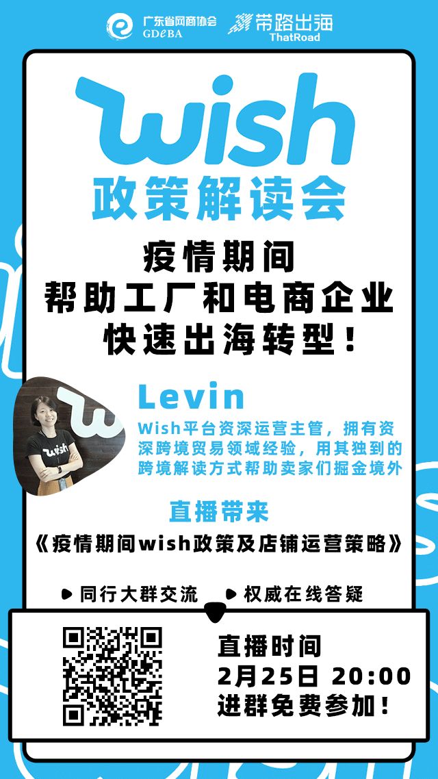 2月25日晚上20:00,協(xié)會聯(lián)合Wish,邀請了平臺資深運營主管為我們深入淺出講解疫情期間品牌招募計劃及運營策略。在線答疑,全面獲得一手wish資訊,助力工廠及傳統(tǒng)電商企業(yè)出海。