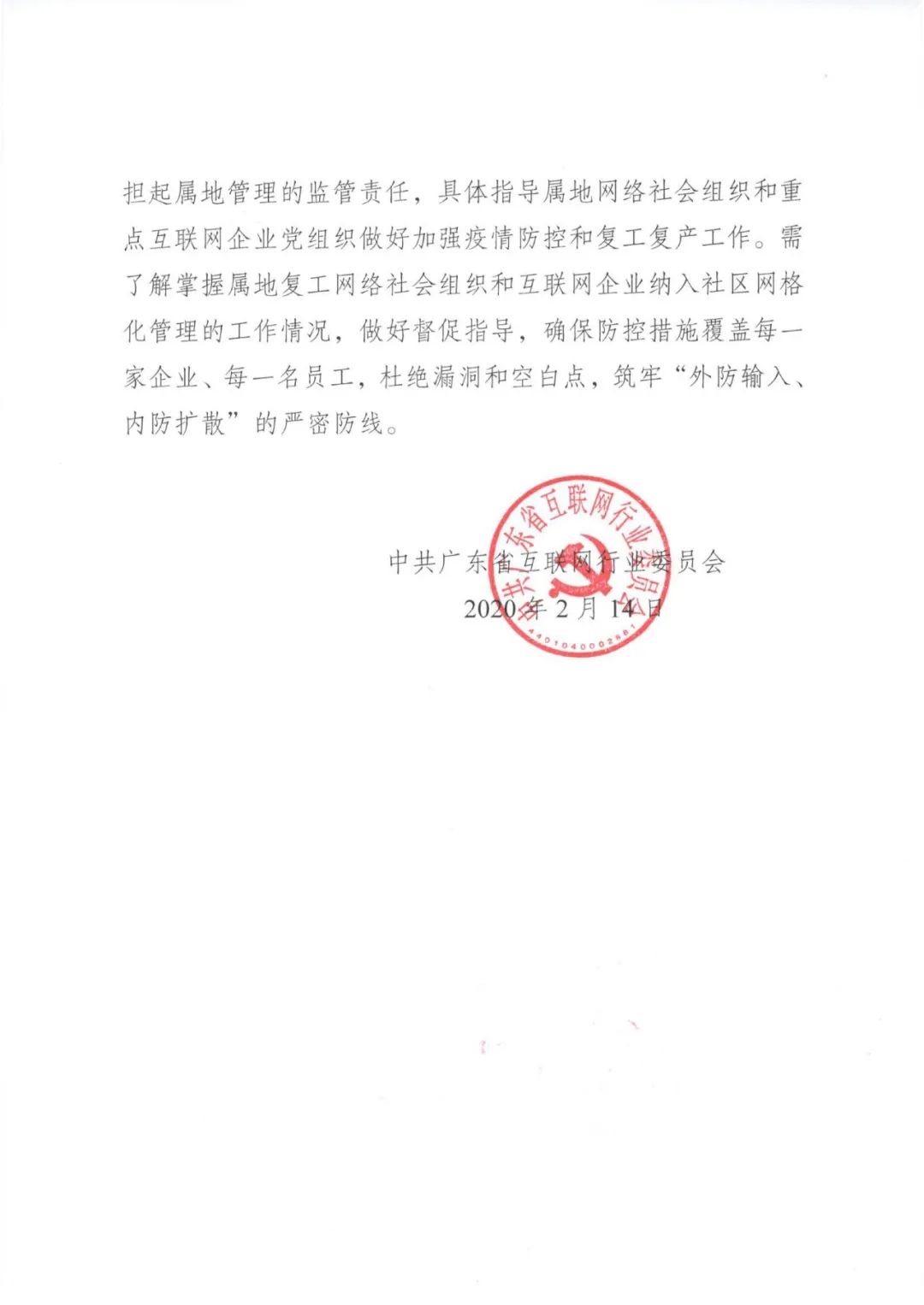 當(dāng)前疫情防控工作已經(jīng)到了最吃緊的關(guān)鍵階段,為貫徹落實中央和省委關(guān)于做好企業(yè)復(fù)工復(fù)產(chǎn)和疫情防控的部署要求,我支部切實發(fā)揮黨組織和黨員積極作用,確保我省互聯(lián)網(wǎng)行業(yè)疫情防控工作更加有力有效。