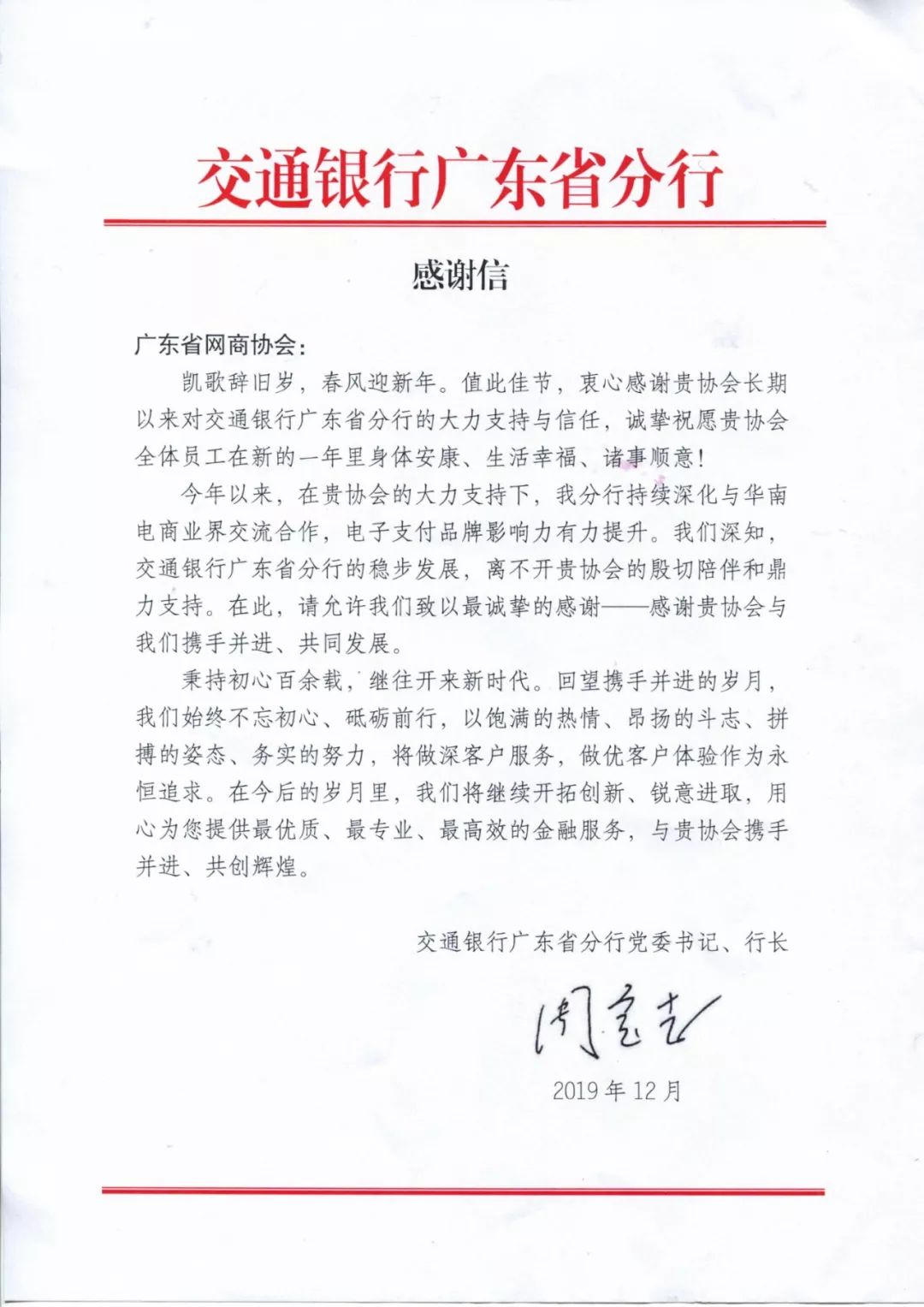 同天下午,我會收到副會長單位:交通銀行廣東省分行的感謝信,感謝協(xié)會攜手并進(jìn)、共同發(fā)展。