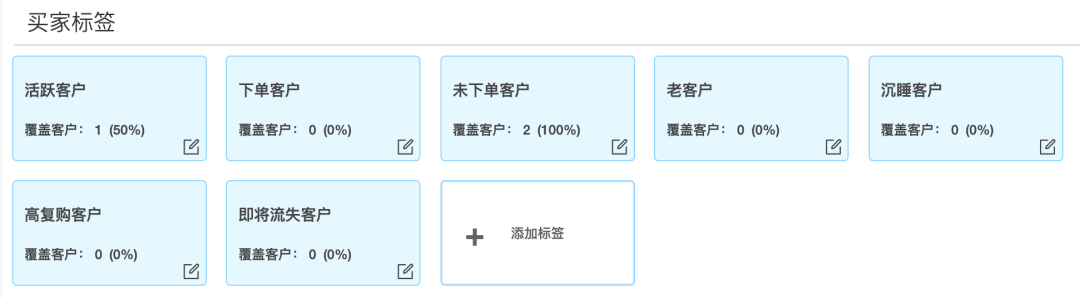 - 系統(tǒng)默認設定活躍客戶、下單客戶、未下單客戶、高復購客戶……等7個高頻常用買家標簽,自動劃分類別;