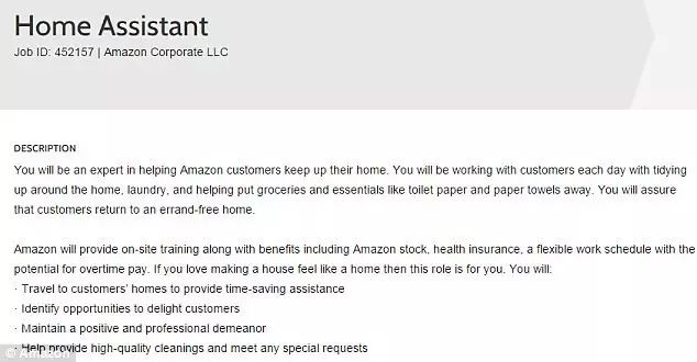 『人工智能當(dāng)?shù)?,Google Play用AI分類應(yīng)用;亞馬遜招聘會(huì)員管家,開(kāi)啟家政服務(wù);貨運(yùn)版Uber要拯救全球最差交通......』 真正服務(wù)到家:亞馬遜要提供家政服務(wù)了 #美國(guó)# #零售電商# 最近,亞馬遜發(fā)布了招聘信息,職位是“家庭助手(home assistant)”,為在西雅圖的亞馬遜會(huì)員管家。雖然只是家政服務(wù)員,但這一職務(wù)是全職崗位,亞馬遜將會(huì)提供完整的福利待遇,包括公司培訓(xùn)、股票、保險(xiǎn)和加班費(fèi)等。 此前亞馬遜也有類似的家政服務(wù),不過(guò)是負(fù)責(zé)幫顧客聯(lián)系家政公司,而此次招聘全職員工后,亞馬遜就能獨(dú)攬?jiān)摌I(yè)務(wù)了。
