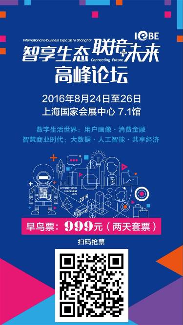 8月24-26日, “2016 IEBE(上海)國(guó)際電子商務(wù)博覽會(huì) 暨互聯(lián)網(wǎng)+科創(chuàng)應(yīng)用展” 將在上海.虹橋.國(guó)家會(huì)展中心舉辦! 展會(huì)期同期將舉辦“智享生態(tài) 聯(lián)接未來(lái)”高峰論壇, 現(xiàn)在早鳥(niǎo)票特惠發(fā)行,與頂級(jí)大咖一起觀看電商科創(chuàng)展!