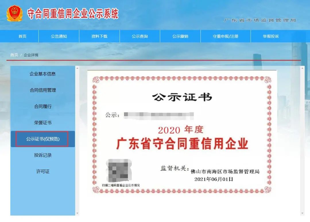 ![]() 恭喜 我會(huì)會(huì)員獲得 “2020年度廣東省守合同重信用企業(yè)”公示 為持續(xù)推進(jìn)企業(yè)守法誠(chéng)信經(jīng)營(yíng),促進(jìn)營(yíng)商環(huán)境優(yōu)化,根據(jù)廣東省2020年度“守合同重信用”企業(yè)公示活動(dòng)統(tǒng)一部署安排,經(jīng)過(guò)自主申報(bào)、監(jiān)管部門(mén)審核、多部門(mén)聯(lián)合征信等嚴(yán)格程序把關(guān)后,各級(jí)市場(chǎng)監(jiān)管部門(mén)對(duì)符合“守合同重信用”條件的轄區(qū)企業(yè)予以公示。目前名單仍在陸續(xù)公示,請(qǐng)未獲公示的企業(yè)耐心等候。我會(huì)秘書(shū)處時(shí)刻關(guān)注公示狀態(tài),將在公示后第一時(shí)間與公示企業(yè)聯(lián)系。 第1步 登陸“守合同重信用企業(yè)公示系統(tǒng)”(網(wǎng)址:http://amr.gd.gov.cn/sz/home),點(diǎn)擊【公示查詢】按鈕 ![]() 第2步 輸入企業(yè)名稱后,點(diǎn)擊【查詢】 ![]() 第3步 公示年度有“2020年”的記錄,則表示審核已通過(guò)。若需要查看電子版公示證書(shū)(無(wú)印章),可點(diǎn)擊綠色框按鈕。 ![]() 第4步 進(jìn)入“企業(yè)詳情”頁(yè)面,點(diǎn)擊【公示證書(shū)】即可查看,鼠標(biāo)右鍵“圖片另存為”或者截圖均可保存。 ![]() ![]()