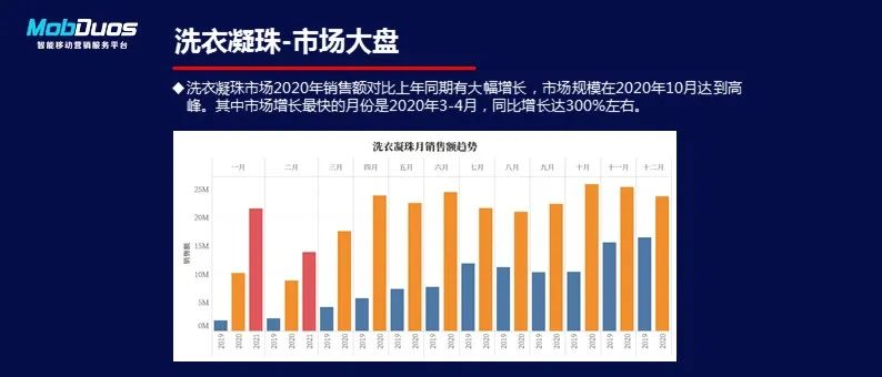 例如清潔劑這類常用品,2020年銷售額對(duì)比上年同期有大幅增長,市場規(guī)模在2020年10月達(dá)到高峰。其中市場增長最快的月份是2020年3-4月,同比增長達(dá)300%左右。也就是說,其實(shí)他的市場大盤夠的,洗衣凝珠作為洗衣劑類的新產(chǎn)品,品牌處于激烈競爭,搶奪市場的時(shí)期,品牌排名變化較大,目前品牌優(yōu)勢(shì)較為突出的是熙梵凝,排名基本穩(wěn)定在行業(yè)首位。 3