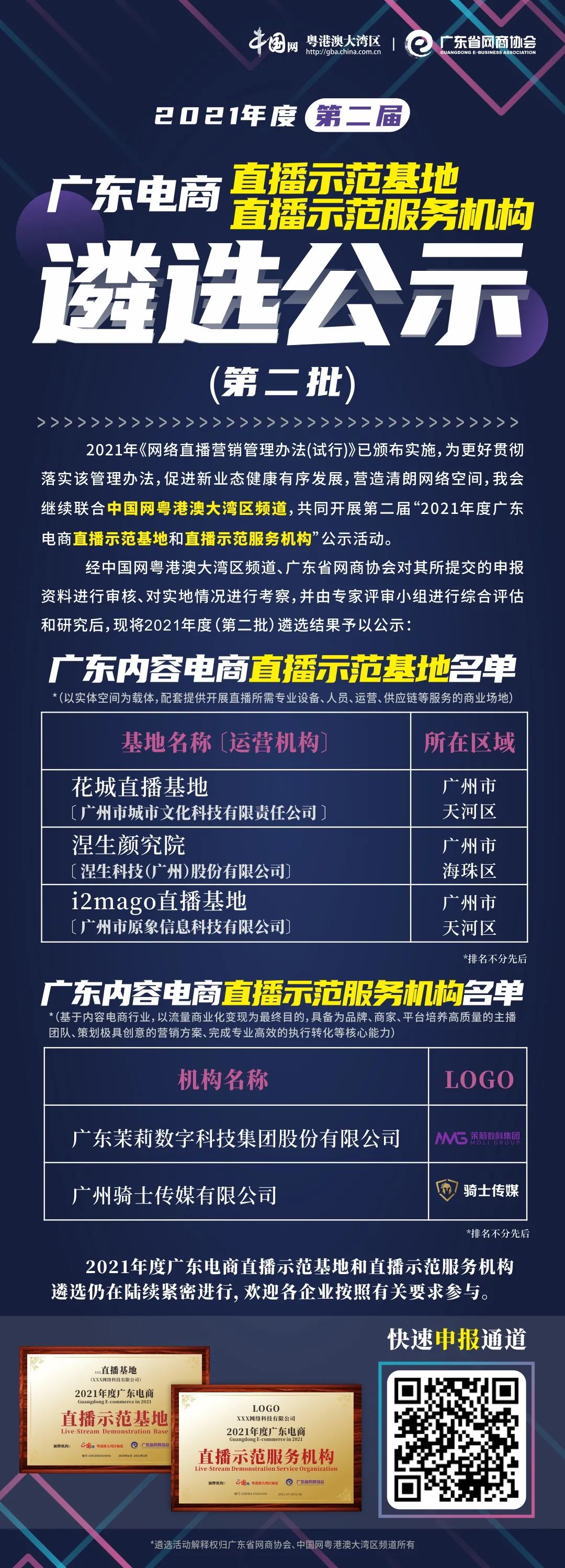 經(jīng)中國網(wǎng)粵港澳大灣區(qū)頻道、廣東省網(wǎng)商協(xié)會對其所提交的申報資料進(jìn)行審核對實地情況進(jìn)行考察,并由專家評審小組進(jìn)行綜合評估和研究后,現(xiàn)將2021年度(第二批)遴選結(jié)果予以公示: