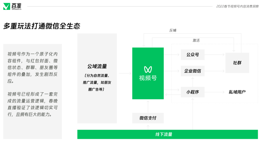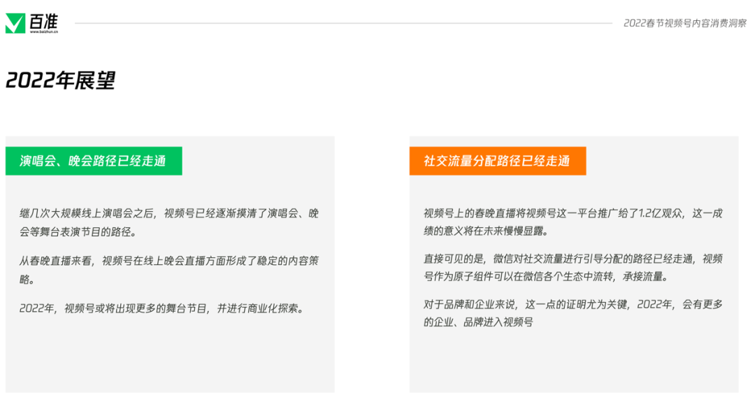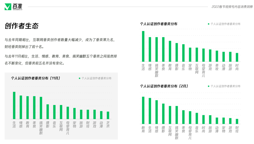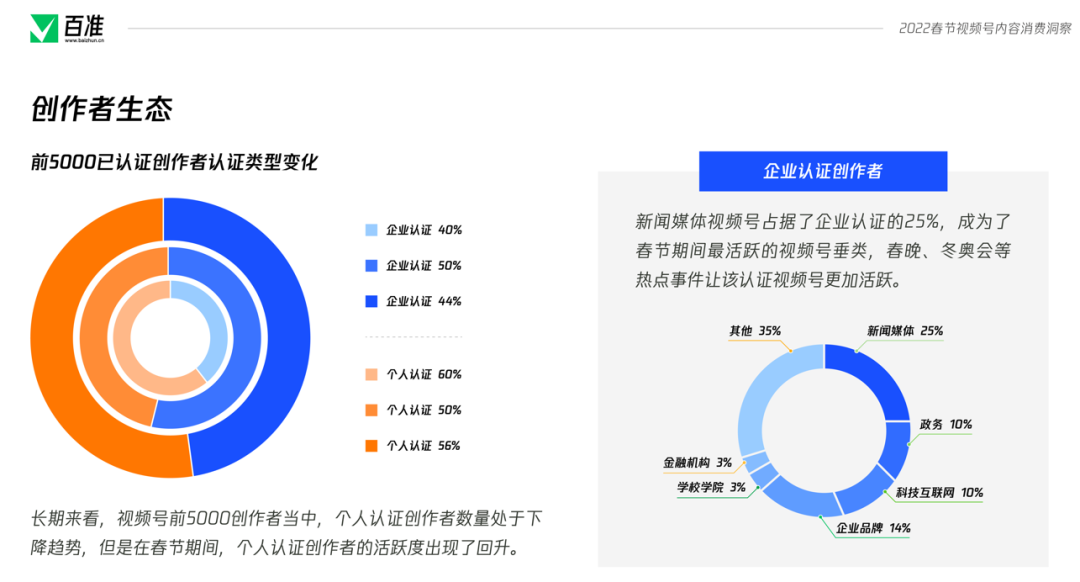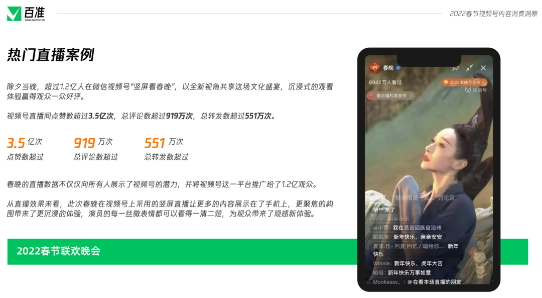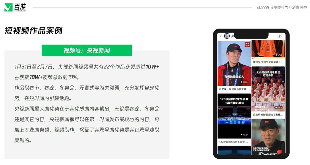 2022年的春節(jié)是一個(gè)特殊的春節(jié),除夕的晚上,視頻號(hào)進(jìn)行了獨(dú)家春節(jié)聯(lián)歡晚會(huì)豎屏直播,在大年初四的晚上,直播了北京2022冬奧會(huì)開(kāi)幕式,兩場(chǎng)直播的場(chǎng)觀都超過(guò)了1個(gè)億,一舉大幅超過(guò)不久之前西城男孩的場(chǎng)觀成績(jī)。 在這個(gè)春節(jié),視頻號(hào)再次與紅包封面進(jìn)行了深度聯(lián)動(dòng),推出了不少玩法,紅包封面不再成為大品牌的專屬,每個(gè)視頻號(hào)博主都有機(jī)會(huì)制作自己的紅包封面,通過(guò)紅包封面與自己的觀眾進(jìn)行互動(dòng),加強(qiáng)情感鏈接,促進(jìn)裂變?cè)鲩L(zhǎng)。 值此時(shí)機(jī),百準(zhǔn)對(duì)春節(jié)期間視頻號(hào)的一系列熱點(diǎn)、動(dòng)作進(jìn)行總結(jié)梳理,發(fā)布《視頻號(hào)春節(jié)內(nèi)容消費(fèi)洞察》報(bào)告,期望幫助更多的博主有所進(jìn)步。掃描文末二維碼添加準(zhǔn)哥兒,即可獲取完整版報(bào)告。 |創(chuàng)作者:新聞媒體視頻號(hào)最活躍 春節(jié)期間,視頻號(hào)創(chuàng)作者活躍度出現(xiàn)了一定的變化,報(bào)告對(duì)春節(jié)期間前5000名視頻號(hào)創(chuàng)作者進(jìn)行了統(tǒng)計(jì)。統(tǒng)計(jì)顯示,春節(jié)期間,個(gè)人認(rèn)證創(chuàng)作者占比達(dá)到了56%,與之前相比出現(xiàn)了一定程度的增長(zhǎng)。 ![]() 在前5000名創(chuàng)作者當(dāng)中,新聞媒體機(jī)構(gòu)占比達(dá)到了總數(shù)的10.6%,在企業(yè)認(rèn)證中,新聞媒體機(jī)構(gòu)占比達(dá)到了25%。目前,新聞媒體機(jī)構(gòu)賬號(hào)已經(jīng)成為了視頻號(hào)創(chuàng)作者生態(tài)中最活躍,數(shù)量最多的一部分。 從個(gè)人創(chuàng)作者垂類分布來(lái)看,近三個(gè)月內(nèi),生活、情感、教育、美食、搞笑五大垂類雖然之間的排名偶有變化,但是牢牢的占據(jù)前五名,是個(gè)人認(rèn)證創(chuàng)作者最活躍也最密集的五個(gè)賽道。 ![]() 而互聯(lián)網(wǎng)垂類,則在幾個(gè)月內(nèi)活躍度有所下降,跌出了前五名。財(cái)經(jīng)垂類則是跌出了前十名,但這并不意味著財(cái)經(jīng)垂類創(chuàng)作者的不活躍,而是更多的財(cái)經(jīng)垂類創(chuàng)作者進(jìn)行了企業(yè)認(rèn)證而非個(gè)人認(rèn)證所導(dǎo)致的。 從榜單來(lái)看,個(gè)人認(rèn)證創(chuàng)作者當(dāng)中,情感、教育、音樂(lè)藝術(shù)等垂類占比較大,其中貴州小蓉兒以音樂(lè)垂類創(chuàng)作者成為了榜首,笑笑悟、一禪小和尚占據(jù)了第二、第三。 ![]() 在企業(yè)品牌榜中,優(yōu)酸乳成為榜首,其拍攝的#少年俠氣闖江湖系列內(nèi)容廣受好評(píng),榜單2至10名則全部由科技互聯(lián)網(wǎng)企業(yè)占據(jù),其中包括網(wǎng)易、騰訊、淘寶、B站、新浪、易車等。 |內(nèi)容:直播間數(shù)量減少33%,觀眾增加110% 報(bào)告統(tǒng)計(jì)了1月29日至2月6日期間所有獲贊超過(guò)10W+的作品,北京、冬奧會(huì)、虎年、春節(jié)、拜年等詞匯成為了這個(gè)春節(jié)視頻號(hào)上的熱詞。 ![]() 在所有獲贊超過(guò)10W+的作品中,「央視新聞」視頻號(hào)脫穎而出成為了春節(jié)期間的大贏家,共有22條作品獲贊超過(guò)10W+,其緊扣春節(jié)、春晚、冬奧會(huì)的優(yōu)質(zhì)內(nèi)容是其脫穎而出的最大優(yōu)勢(shì)。 ![]() 在直播方面,1月31至2月7日視頻號(hào)上共進(jìn)行了2993場(chǎng)直播,與春節(jié)前一周相比,直播間數(shù)量減少了33%,但是觀眾總數(shù)卻從8700萬(wàn)增多至1.9億,增幅達(dá)118%。 ![]() 春晚和冬奧會(huì)兩大直播為視頻號(hào)吸引了大量的用戶進(jìn)入視頻號(hào),造成了觀眾數(shù)量的大幅增加,讓春節(jié)期間堅(jiān)持開(kāi)播的直播間數(shù)據(jù)都出現(xiàn)了上升。 ![]() 除夕當(dāng)晚,有1.2億人在微信視頻號(hào)觀看了春晚,春晚直播間點(diǎn)贊數(shù)超過(guò)3.5億,總評(píng)論數(shù)超過(guò)919萬(wàn)次,總轉(zhuǎn)發(fā)超過(guò)551萬(wàn)次,這樣的成績(jī)證明了視頻號(hào)的潛力,這次直播也成為了視頻號(hào)發(fā)展中重要的里程碑。 |新年新開(kāi)始:社交流量分配路徑已經(jīng)走通 視頻號(hào)作為一個(gè)原子化內(nèi)容組件,與紅包封面、微信狀態(tài)、群聊、朋友圈等組件的疊加發(fā)生劇烈反應(yīng),讓春晚的場(chǎng)觀達(dá)到了1.2億。 ![]() 目前視頻號(hào)已經(jīng)形成了一套完整的流量運(yùn)營(yíng)邏輯,春晚直播驗(yàn)證了該邏輯切實(shí)可行,且擁有巨大的能力。 繼幾次大規(guī)模線上演唱會(huì)之后,視頻號(hào)已經(jīng)逐漸摸清了演唱會(huì)、晚會(huì)等舞臺(tái)表演節(jié)目的路徑。從春晚直播來(lái)看,視頻號(hào)在線上晚會(huì)直播方面形成了穩(wěn)定的內(nèi)容策略。2022年,視頻號(hào)或?qū)⒊霈F(xiàn)更多的舞臺(tái)節(jié)目,并進(jìn)行商業(yè)化探索。 微信對(duì)社交流量進(jìn)行引導(dǎo)分配的路徑已經(jīng)走通,視頻號(hào)作為原子組件可以在微信各個(gè)生態(tài)中流轉(zhuǎn),承接流量實(shí)現(xiàn)快速啟動(dòng)。 對(duì)于品牌和企業(yè)來(lái)說(shuō),這一點(diǎn)的證明尤為關(guān)鍵,視頻號(hào)誕生之初,很多企業(yè)品牌對(duì)視頻號(hào)持觀望態(tài)度,因?yàn)樗麄儾恢劳度氲揭曨l號(hào)中