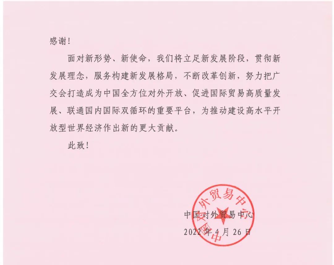 感謝信任!第131屆廣交會向我會發(fā)來感謝信
