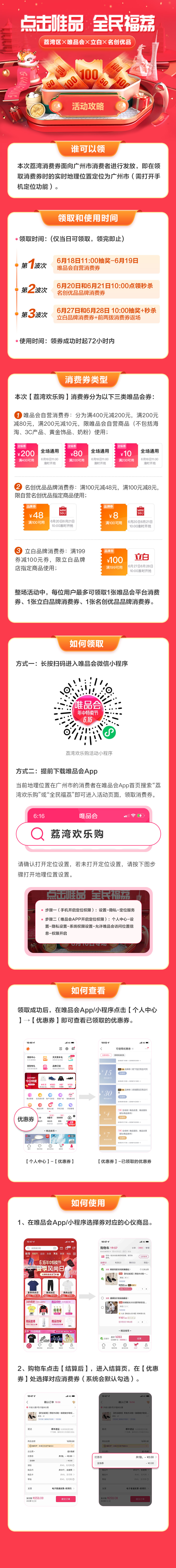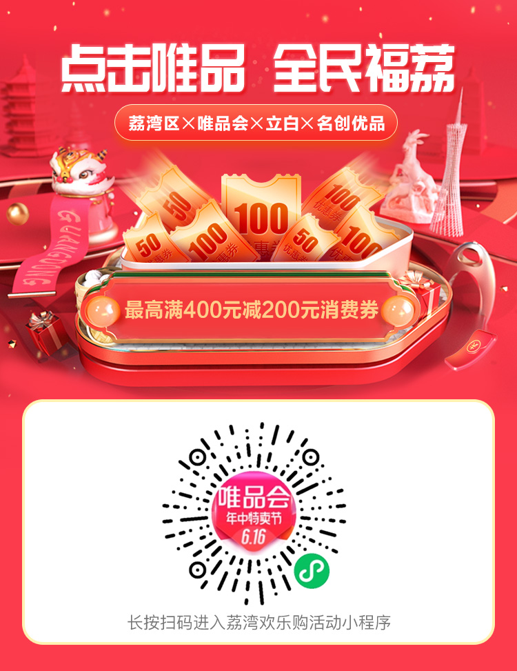 據(jù)了解,本次活動平臺為唯品會APP、唯品會小程序,活動分為兩輪進(jìn)行。今年6月18至21日和6月27至28日,每天早10點開始搶券(6月18日11點開始搶券),廣州市民可在唯品會APP首頁點擊彈窗“點擊唯品 全民福荔”進(jìn)入抽獎頁面,或搜索“全民福荔”、“荔灣歡樂購”、“荔灣消費券”進(jìn)入活動專題頁面。每天活動名額有限,搶完即止。