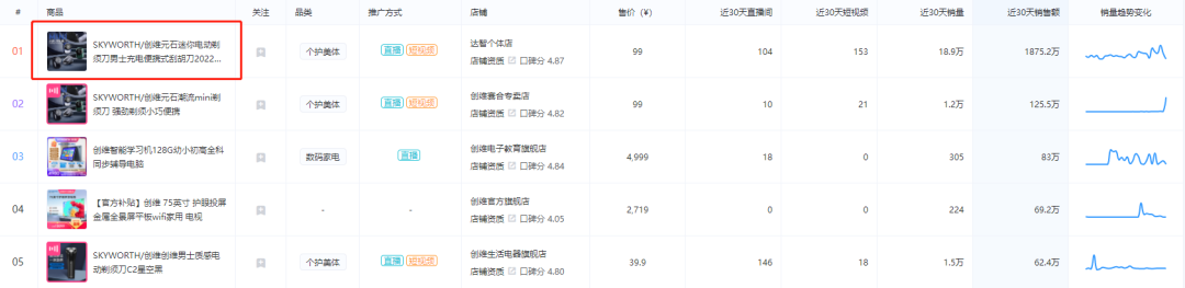 進一步看創(chuàng)維的商品列表,可發(fā)現(xiàn)在近期熱銷TOP5商品中,以排名TOP1的剃須刀和TOP3的智能學(xué)習(xí)機的銷量呈現(xiàn)持續(xù)上升的趨勢。其中,銷量位居第一的創(chuàng)維元石迷你電動剃須刀,更是30天內(nèi)賣出18萬+件,銷售額高達1875.2萬,占品牌總銷售額約6成。