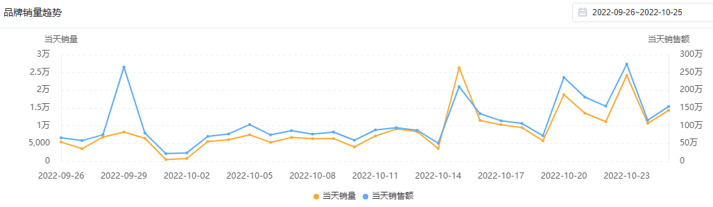 今天,有米有數(shù)電商課堂為大家?guī)硪粋€熱銷的個護美體品牌——創(chuàng)維。從下方創(chuàng)維的銷量與銷售額趨勢,可見該品牌在抖音雙11好物節(jié)大促前30天內(nèi)(2022年9月26日-10月25日)銷量節(jié)節(jié)攀升,總銷量超26萬,總銷售額實現(xiàn)3200萬+!!!