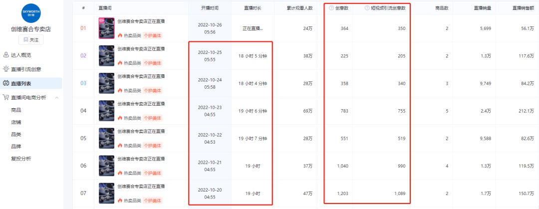 而值得關(guān)注的是,從@創(chuàng)維賽合專賣店每場直播的投流創(chuàng)意數(shù),可發(fā)現(xiàn)他們直播期間都會大批量投流,且主要以引流短視頻為主。