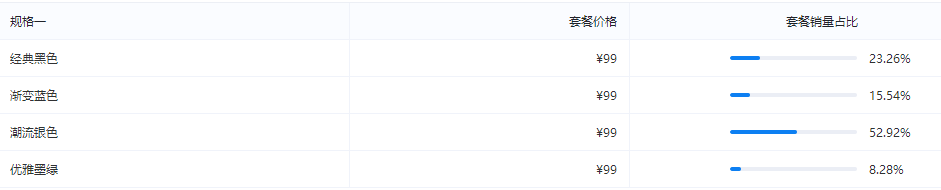 在該款創(chuàng)維元石迷你電動剃須刀的SKU搭配方面,可以發(fā)現(xiàn)這產(chǎn)品有經(jīng)典黑色、漸變藍色、潮流銀色、優(yōu)雅墨綠四款顏色選擇,超50%的消費者偏愛銀色這款,也有20%以上的消費者選擇經(jīng)典不挑款的黑色。