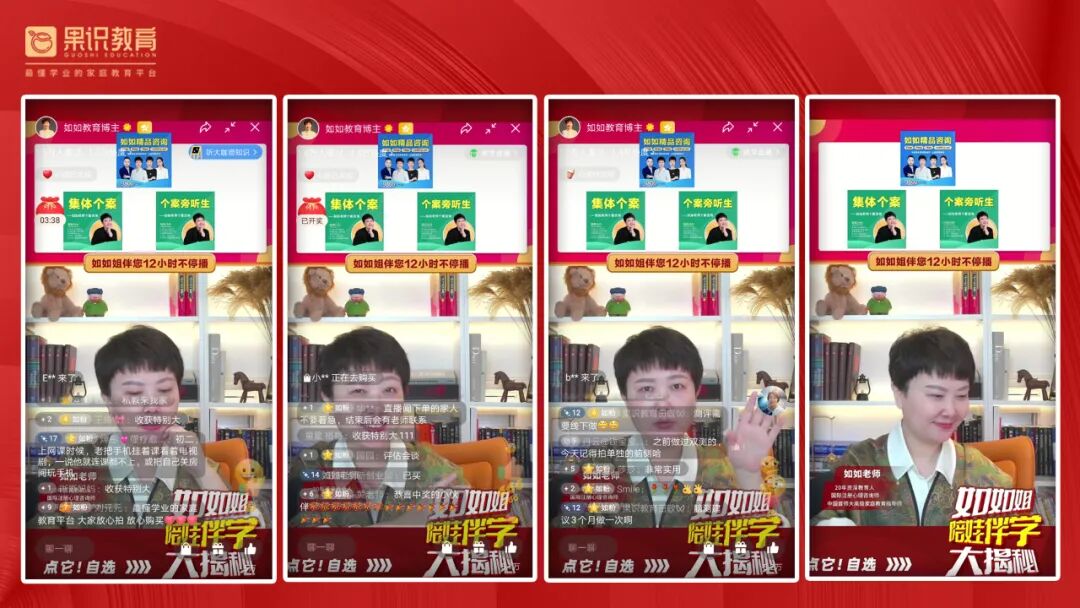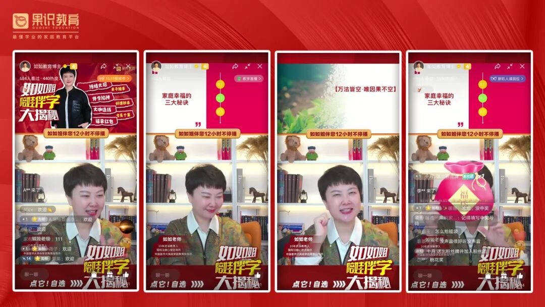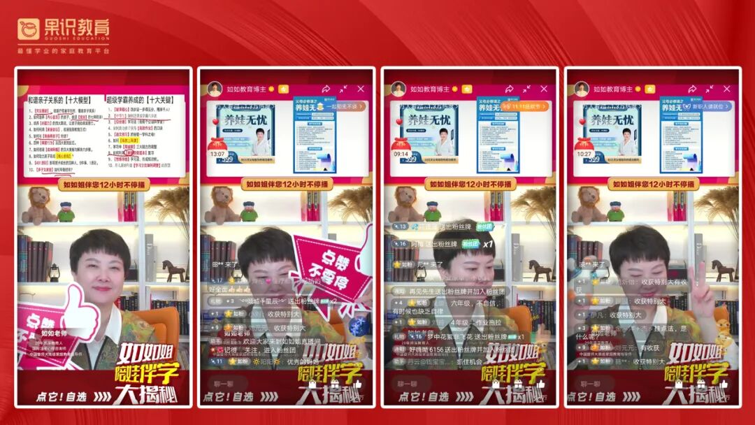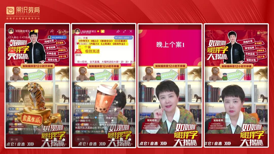 2022年11月10日10:00-22:00 “如如老師陪娃伴學(xué)”專題直播 重磅開啟,全天解密 學(xué)智慧,做個(gè)案,搶優(yōu)惠 你陪娃,如如老師陪你 提前解鎖雙11 12小時(shí)全天直播 30000人觀看學(xué)習(xí) 做高能媽,養(yǎng)優(yōu)秀娃,創(chuàng)幸福家 接下來,小編用6大關(guān)鍵詞,帶你盤點(diǎn)本次專題直播的精彩環(huán)節(jié)~ 疫情時(shí)代下,“居家伴學(xué)”成了大部分父母的日常。 為了解決父母焦慮,幫助父母深度學(xué)習(xí)教育智慧,如如老師特開啟全天候12小時(shí)不間斷連續(xù)直播,毫無保留地分享“親子關(guān)系”、“高效伴學(xué)”等秘密。 如如老師的直播,結(jié)合教育理念和實(shí)用伴學(xué)方法,使父母懂得如何為孩子“構(gòu)建學(xué)習(xí)型的家庭環(huán)境”,帶領(lǐng)父母為孩子做“家庭教育的精裝修”,解決家庭教育的最后一公里。