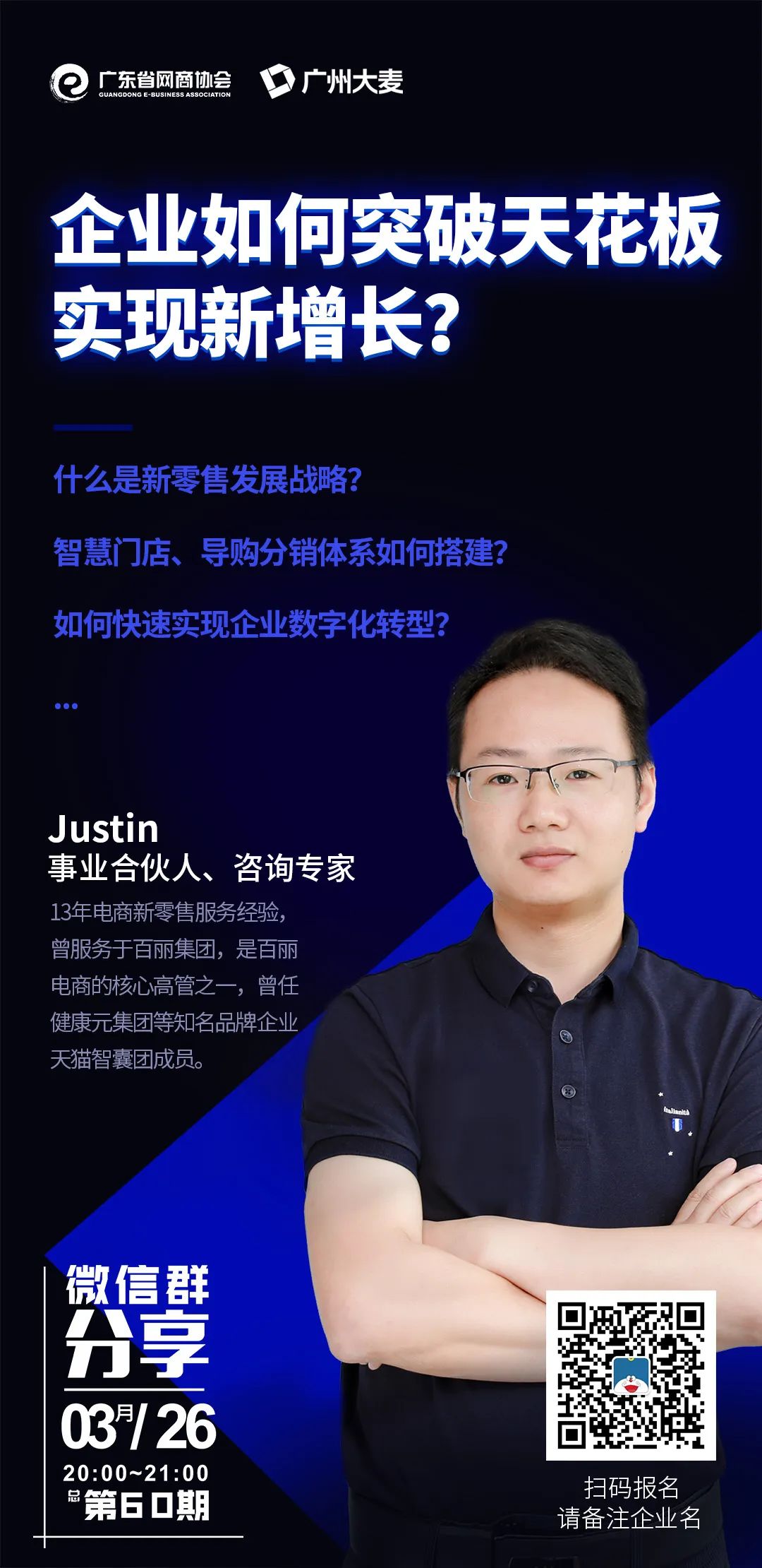![]() 3月26日,微信群分享迎來第六十期,本期我們請到來自副會長單位廣州大麥的事業(yè)合伙人Justin,來為我們分享關(guān)于品牌企業(yè)新增長的一些見解。Justin擁有13年電商新零售服務(wù)經(jīng)驗(yàn),曾是百麗電商的核心高管,曾任健康元集團(tuán)的天貓智囊團(tuán)成員。