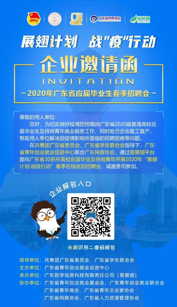 ![]() 為切實做好疫情防控期間廣東省2020屆普通高校應(yīng)屆畢業(yè)生及待崗青年就業(yè)服務(wù)工作,同時助力企業(yè)復(fù)工復(fù)產(chǎn)幫助用人單位解決因疫情影響所面臨的招聘困難等問題。 在共青團(tuán)廣東省委員會、廣東省學(xué)生聯(lián)合會指導(dǎo)下,廣東省網(wǎng)商協(xié)會聯(lián)合廣東省青年創(chuàng)業(yè)就業(yè)促進(jìn)中心,通過易展翅平臺面向廣東省30多所高校高校應(yīng)屆畢業(yè)及待崗青年開展2020年翅計劃戰(zhàn)疫行動”春季在線巡回招聘會,我們誠邀會員單位參加。 詳情及招聘場次, 歡迎掃碼加小秘書,并回復(fù)zp了解及報名