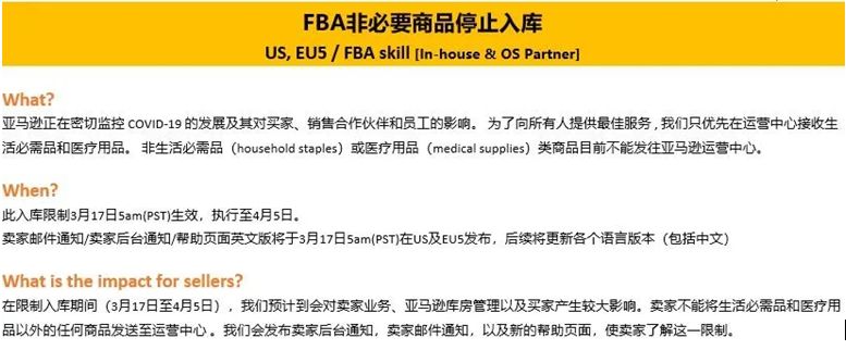3月17日下午,亞馬遜官方論壇發(fā)布一則關于“FBA非必要商品停止入庫”的通知,跨境小助手先整理了解到的信息給大家。具體內容如下: