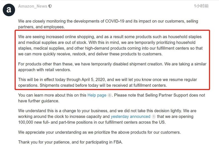 翻譯: 我們正在密切監(jiān)視COVID-19的發(fā)展及其對我們的客戶,銷售合作伙伴和員工的影響。 我們看到在線購物有所增加,因此一些產品(例如家庭必需品和醫(yī)療用品)缺貨??紤]到這一點,我們暫時優(yōu)先考慮進入我們的運營中心的家庭必需品,醫(yī)療用品和其他高需求產品,以便我們可以更快地接收,補充庫存并將這些產品交付給客戶。 對于這些以外的產品,我們暫時禁止了發(fā)貨計劃的創(chuàng)建。我們正在與零售供應商采取類似的方法。 此入庫限制在3月17日生效,執(zhí)行至2020年4月5日,一旦恢復正常運營,我們將通知您。今天之前創(chuàng)建的發(fā)貨計劃和在途貨物的接收不會受到影響。 我們了解這是對您的業(yè)務的重大更改,因此我們不會輕易做出此決定。我們日以繼夜地提高產能,昨天宣布,我們將在美國各地的運營中心開設100,000個新的全職和兼職職位。